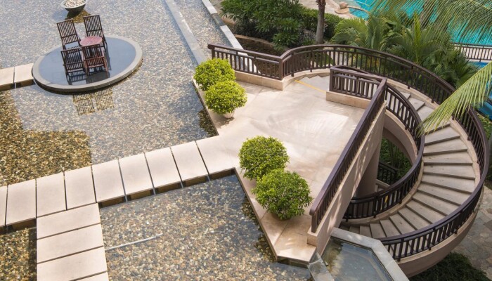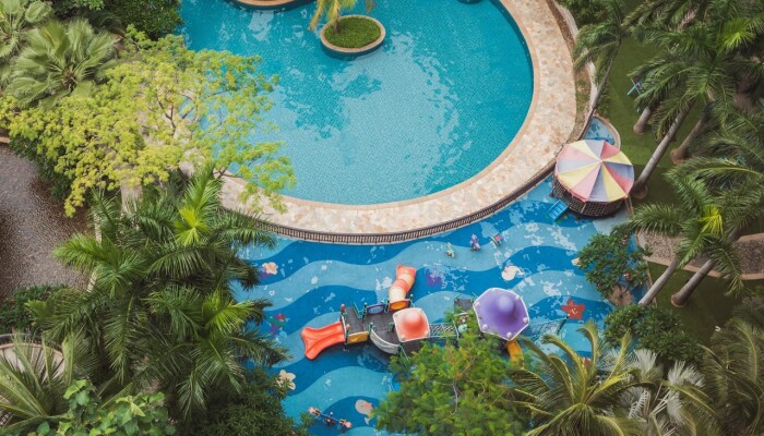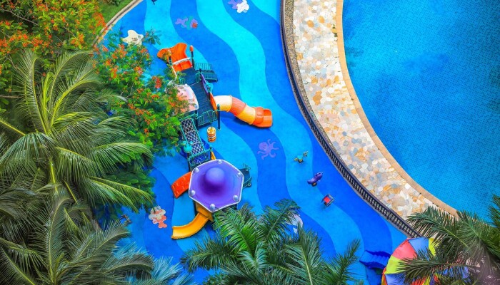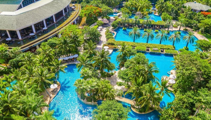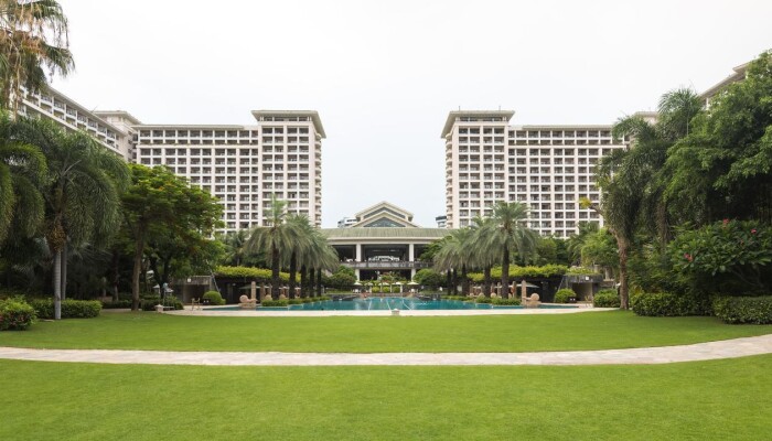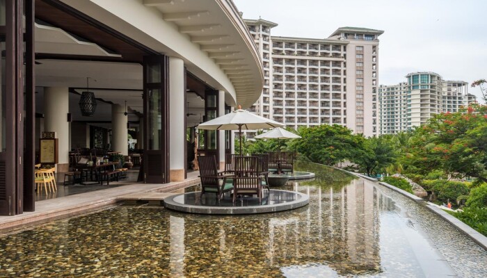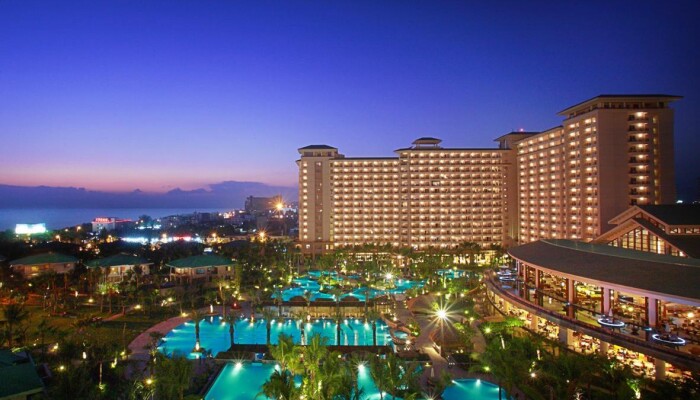 Огромная территория,бассейны,закрытый бассей,дороговатый спа-центр,свой пляж.Переход к пляжу подземный,что очень удобно,т.к. дорога довольно оживленная.Пляж охраняется и утром там только русские.Китайцы в море не купаются.Появляются только вечером,когда солнце садится.Бассейны работают до 23 часов,есть маленький бассейн с рыбками для пилинга.30 мин.-100 руб. по курсу.